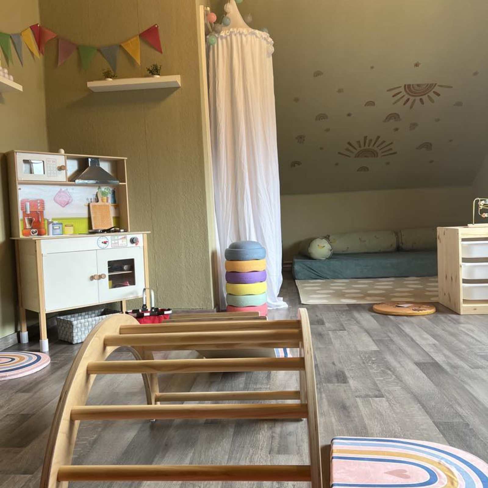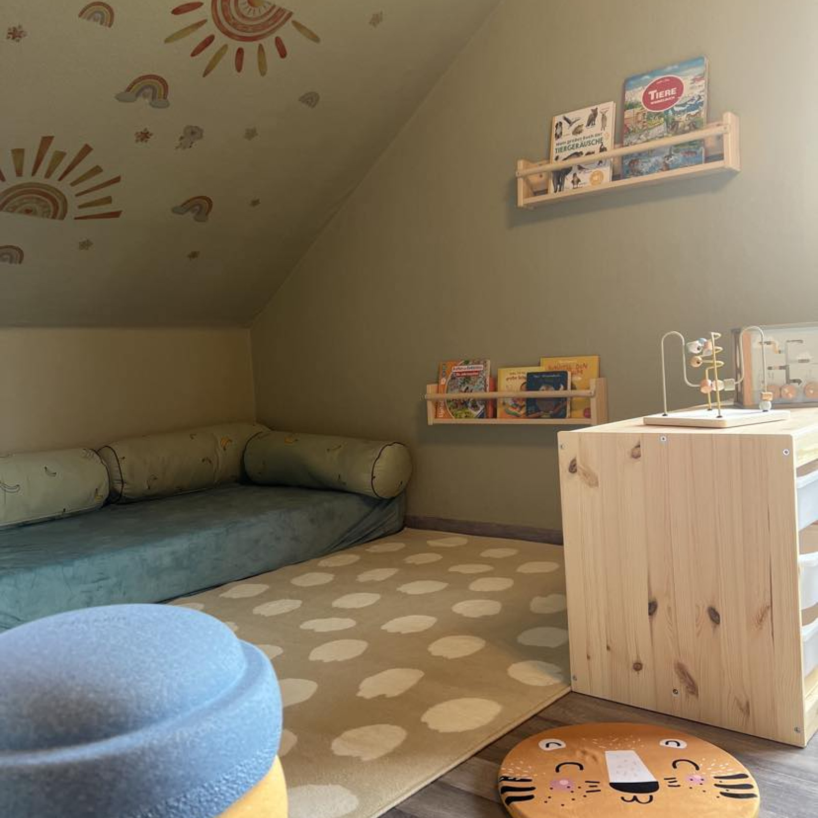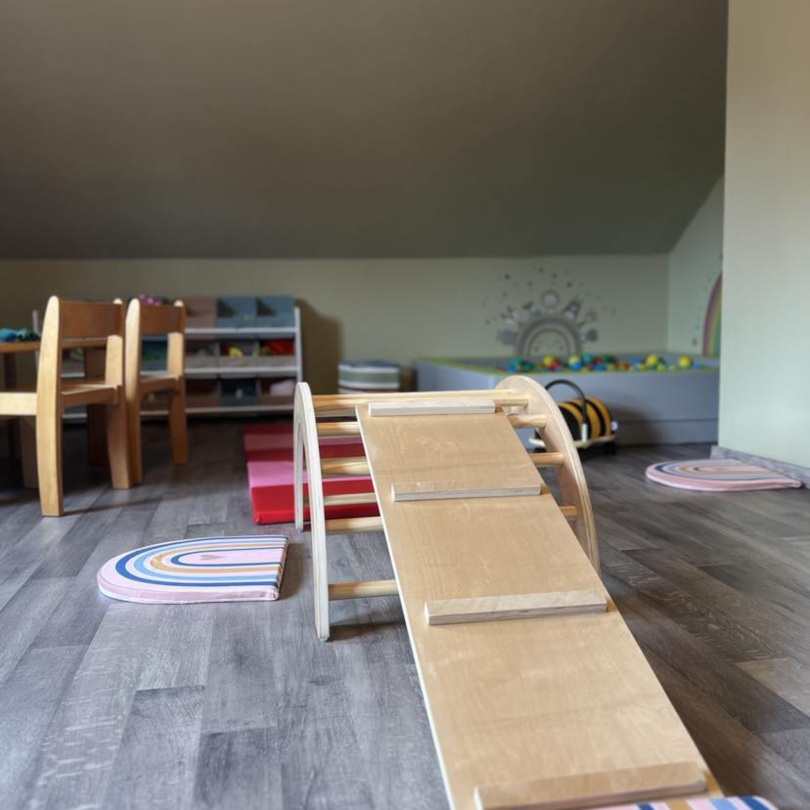 Das Spielzimmer ist hell und freundlich. Es lädt zum spielen, toben, klettern und kreativ sein ein.